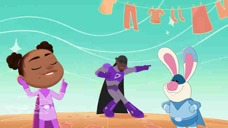 Hey AJ is one of those shows where kids use their imagination to get through some situation and teach both the characters and kids at home some valuable life lesson. In the second story of the eighth episode, “Don’t Mess With AJ”, our plucky young heroine just wants to watch a marathon of her favorite superhero before the next movie comes, but her mom insists she has to clean her room. Since the hero is a self-proclaimed “grimefighter” instead of a crimefighter, she imagines that he helps Super Duper AJ (she’s like 5) and her loyal sidekick Wonder Hare (her stuffed bunny rabbit Theo, because toys come to life in these fantasies) clean her headquarters and learn the importance of keeping her room clean before fighting one of his arch-enemies, the trash-spewing Dumpster.