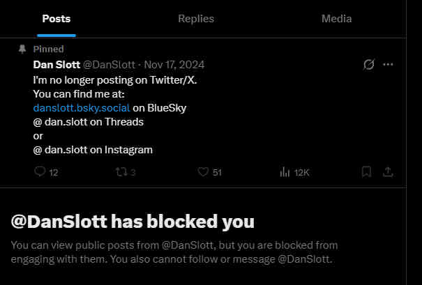Yep, I’m still blocked. Not that it matters since he’s one of those creators who ran off to Bluesky the moment free speech included his political opposites. I don’t even know why he blocked me, unless it has something to do with someone I follow. I know he blocks everybody who follow Douglas Ernst. It’s okay, I returned the favor because of his reputation of payback. So unless he follows the site directly…