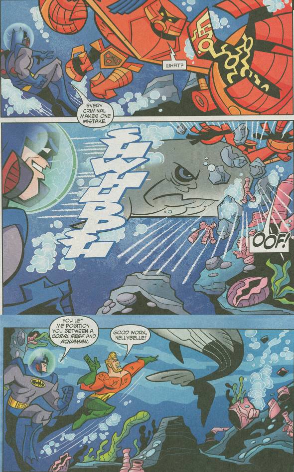 After a quick adventure with Aquaman, Batman is called to London, where a multi-mouthed monster is wrecking the city. The creature is controlled by Lex Luthor and he’s using it to steal the Crown Jewels. Power Girl is also in England, and she discovers the people are formed by people (a side effect of a machine Luthor was testing that he decided to use to his advantage. Together, Batman and Power Girl save the people and capture Luthor. Yay!