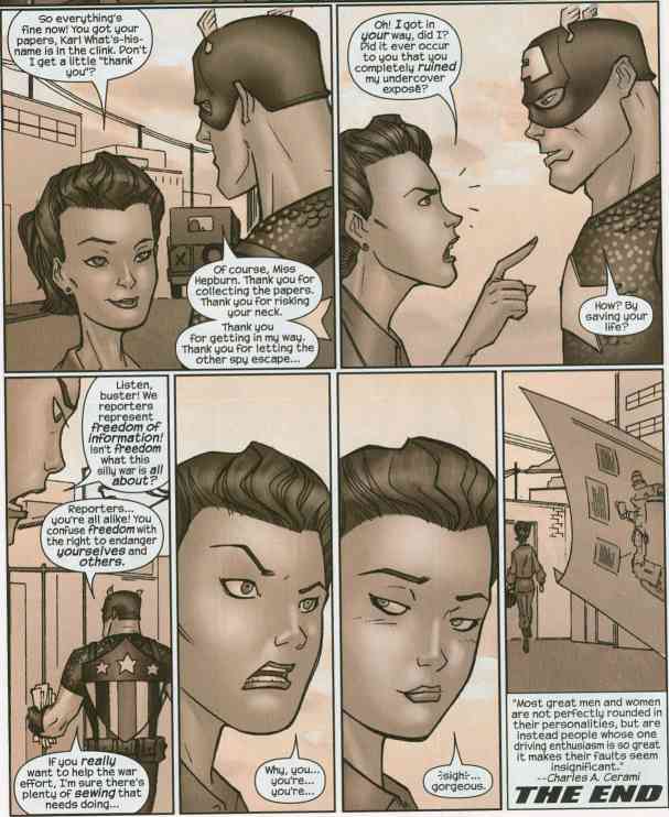 What they got right: It was nice of them to include a tale from WW2. The story’s a bit short to really get a read on anyone, but it’s a fun story, even including an in-joke for older readers who know something of Captain America’s war days. They also remember a little about money and the treatment of women of the era. Anywhere else, Cap’s comments to Rosalind would be considered sexist, but back then it’s how people thought.