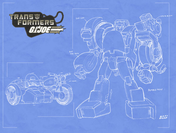 Plan-style image of Bumblebee in robot and World War II motorcycle and sidecar mode.