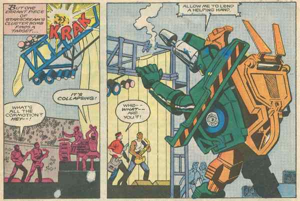 Later, Optimus Prime contacts the team with the lowdown that the mean machine himself, Shockwave, was planning to hit a major source of sonic energy in the area, and Skids is sure they mean the concert. So off the Autobots go to check out the 10th Avenue Band and their main man in action.