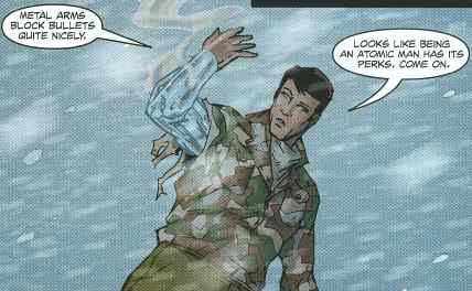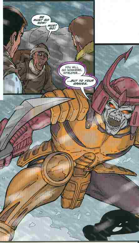 The story begins in the Himalayan Mountains, circa 1978. Joe Colton, Chok-Pa, and Mike Power (the Atomic Man) are tracking down General Mihai, but as the enemy forces attack they themselves are attacked by weird plant weapons. Chok-Pa knows the legend of “Kohbrala” well, and begs his friends to make a run for it, when they are attacked by a giant samurai with a skull face. (Any Transformer fan immediately recognizes the Decepticon Pretender “Bludgeon”.) Bludgeon kills the Atomic Man, and the others are taken alive by Pythona and a group of Cobra-La soldiers.