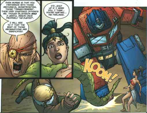 So a good finisher on a rather good crossover series, certainly better than Dreamwave’s offering, and perhaps even better than the old Marvel run. (Transformer fansite The Disciple of Boltax is currently reviewing the original comics, if you want to take a look.) Devil’s Due no longer has the license on either series, as IDW now has the rights to both. Since they just obtained the Joe license (I don’t know why DD lost it, but if they’re poor showing on the Voltron series as far as deadlines are any indication, I can come up with a theory or two), it may be quite some time before we see a crossover again outside of fan projects. (Stop by Saturday when I put one such project in the Showcase, my second online comic entry.) After all, they need to establish their own Joe Universe first. But who knows what the future holds, or how long before “Yo, Joe!” and “Transform and Roll Out!” are once again heard on the same battlefield!