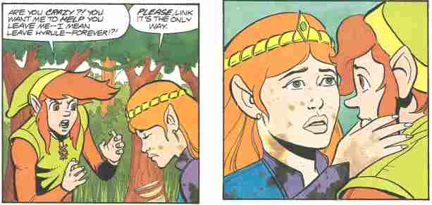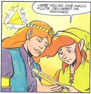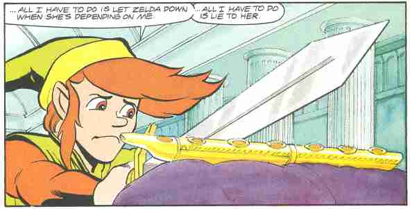 But what’s this? After a whole page endless weeks of searching, hiding, and fighting, are our heroes having second thoughts? Is Link really ready to let the girl he loves leave his life? What if the flute had been missing? Yeah, all he has to do is smash it! Then she can’t leave, and they can have numerous games adventures together again. All he has to do is destroy it and tell her it wasn’t there. All he has to do…