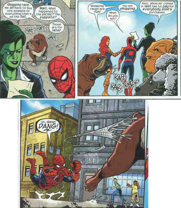 What they got wrong: The aforementioned disappearing web lines. It really pulls you away from the story when they’re gone one panel and back the next time you see him. Marcelo’s She-Hulk is passable, but Tigra looks too much like She-Hulk in the face. Also, while Spidey is in his costume the whole time, Every fight they get in sees She-Hulk is less clothing. First she loses her jacket, then the rest of the outfit. Luckily she has her usual fighting outfit on underneath, since this is a kids-targeted comic. Speaking of which, at what point does Tigra find time to change to her fight suit? There doesn’t seem to be enough time passing.