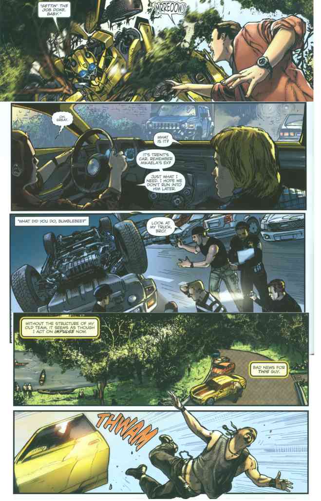 What they got right: We’re told right on the credits page that this story takes place between the end of the Alliance prequel series and the beginning of Revenge of the Fallen. Apparently, this is the “All Hail Megatron: Coda” of the Movieverse, trying to fill in the gaps between IDW’s prequels and the movie. It’s funny to watch Bumblebee try to be helpful to Sam and fit in as his car again.