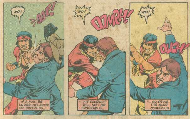 Well, I found the only issue I have of Marvel’s top kicker (Iron Fist is more of a punch master, Marvelites) telling some guy what he can do with his “two bits”. Also, I have worked according to Spacebooger‘s adjusted rules. Three consecutive panels ending with THE ONLY furious flying foot!