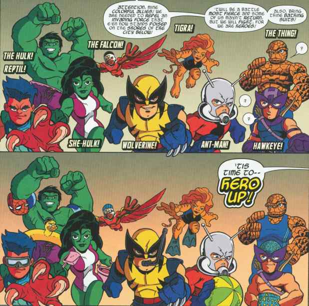 Floyd, Iowa: Captain America, Iron Man, and Thor are called to help when the townspeople have gone mad and had a town-wide fight. The place is a mess, and some of the townspeople didn’t make it. (“Kids story” term for “dead”.) Found among the rubble is Sue Storm, the Invisible Woman from the Fantastic Four, who attacks the three heroes after being set free. She is defeated (when Cap punches her lights out–seriously) and comes around wanting to help. The culprit appears to be a creature inadvertently created by Diablo. The Vision is called in to help as well, and the heroes track Diablo to Yale University (yay, a Connecticut reference that doesn’t involve blowing up a major city–we have enough people leaving the state as it is), where he is looking for a specific book. The group of heroes are able to defeat the creature, and Cap wonders if they should consider staying together as a team.