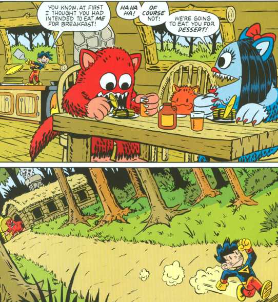 Great Man wakes up to find out he’s dead. Actually, he, Glendolf and G-Man end up in the spirit realm. It still scares some sense into Dave, who not only gives people their money back, but is relieved to hear that Mikey survived. Unfortunately, he’s on the run from monsters until he comes across one of his hero friends, the Marksman. We also find out that Red Girl Princess Roja wants to go out with Great Man for…anything with butter on it, and that there may be a way to restore G-Man and Great Man’s powers.