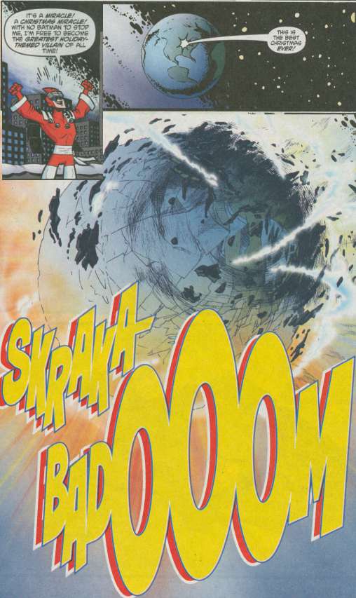As Batman captures Calendar Man, he’s whisked off to Rann just as the Earth is destroyed. On Rann, Batman helps Adam Strange and his wife, Alana, find the source of the anti-matter wave that destroyed Earth and other planets and reverse it, thus restoring all the destroyed planets and saving Christmas.