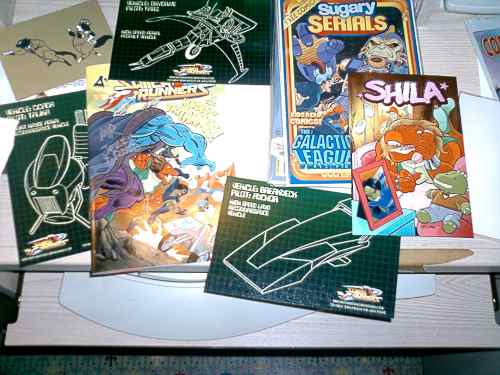 I got this in the mail this week. I’ve already reviewed Switch Runners the online version. Now the print version is available, as I’ve reported. Well, I have my copy. The comic version may or may not come with Mark Rudolph and Jerzy Drozd’s signatures (the “MR” doesn’t stand for “Mr Jerzy Drozd” 🙂 ) or the Sugary Serials comic from the Kids Read Comics convention. I’m pretty sure you do get the big cards with pictures of the vehicles and the Shila art. I know you won’t have this message: