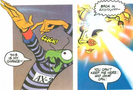 Rob-Corp (a one-shot villain group) decides to break bad guys Space Ghost’s defeated in the past out of Gaolworld prison as part of a plan against our hero. But first they need to get them out. So they contact Zorak mentally and gives him a replica of Space Ghost’s famous “power bands” so he can run a prison break.
