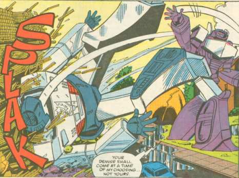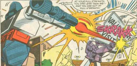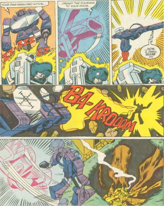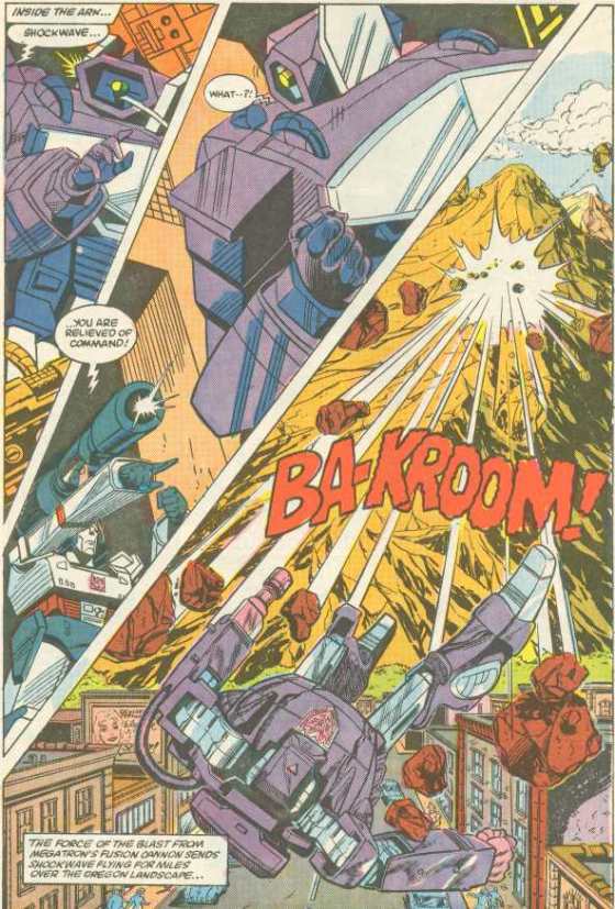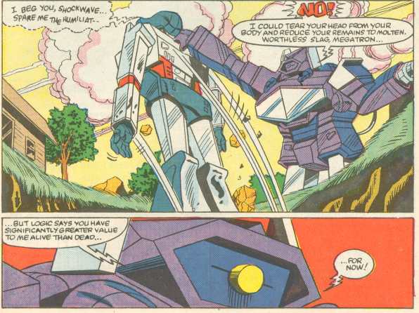 Well, soft for Shockwave. Knowing that it will take more than that, Megatron pursues his quarry. Which leads to either a misplaced word bubble…