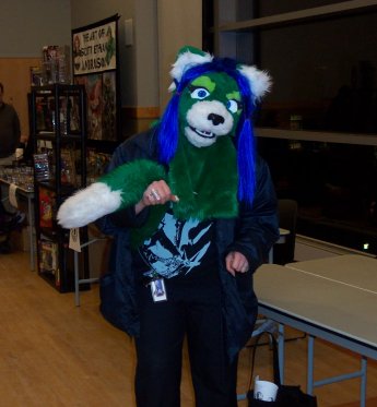 Actually, her mask was rather innovative as anthro heads go. It was set up so that when she moved her jaw, the mouth moved. If it’s cold enough in the room she only has to take the head off to eat, but she can drink through a straw and sometimes the mouth moves when she talks. She’s working to get the full outfit, but she can claim were…is she a wolf? My skills are poor.