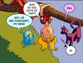 It’s been a while since I’ve done a webcomic, so let’s correct that oversight. I’ve brought up Sugary Serials, the comic site with a Saturday Morning cartoon theme. Usually, it’s a comic by Jerzy and Mark, but there are plenty of other contributors, so tonight I’d like to induce you to read a comic that isn’t a sci-fi action story. It’s a touching story about a little girl and her two imaginary friends. I introduce to you: