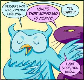 What I really like about this comic is how well the characters play off each other, with a variation of the Star Trek bridge crew if you think about it. The owl would be the logical one (Spock) and the cat more the act first/think second type (vaguely McCoy), with Miranda keeping peace between the two and perhaps even learning something from both.