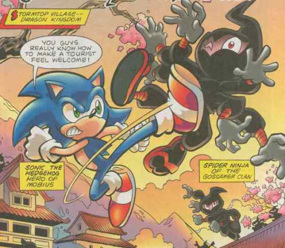 Hoping to take down the Iron Kingdom from the “back end”, Sonic, Tails, Sally, and Ken travel to the Dragon Kingdom to make contact with the Gossamer Clan (the spider ninjas). After much discussion and catching up. the Bride of the Clan decides to side with the Freedom Fighters. However, a message from the Yagyu Clan arrives rather abruptly, as they want a meeting of their own.