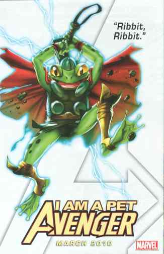 Remember when I posted some homemade posters of the Pet Avengers (done in the style of the “Heroic Age” Avengers posters)? Well, I guess they weren’t so forgotten. In the pages of the Super Hero Squad comic I reviewed earlier today I actually found an official promo for Frog Thor.