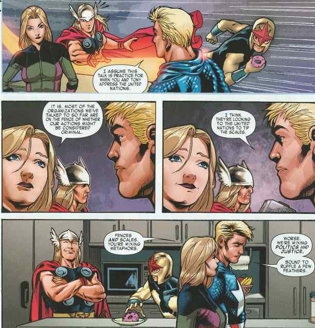 As Captain America and Sue Storm talk Thor and Nova argue silently about the last donut.