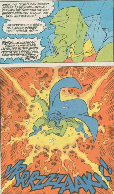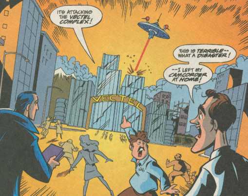 So really, not much of a fight. The ship ends up beating itself by accident, and will crash into one of those abandoned buildings cities conveniently place around the city to make these fight look cool. So being a kids comic, nobody gets hurt.
