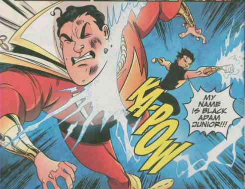 “Black Adam, Jr.” begins to finally get his payback against Captain Marvel, until he realizes that Black Adam isn’t a good guy (although Freddie’s still not convinced Marvel is). Adam learns that the Wizard has the amulet, and journeys to the Wizard’s place to retrieve it. Although, the Marvels and Freddie try to stop him, Adam gets the scarab, but he cannot open it. Theorizing that the Wizard can, he grabs Shazam and blows out the torch, causing both the Wizard and Black Adam to disappear.