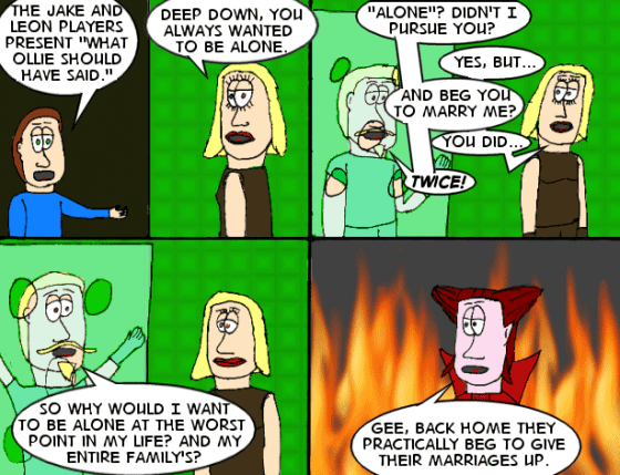 I kind of rushed the comic because I was in a hurry, having been called in to work today. Click the comic to see which of our cast is playing which parts (the narrator is obvious 😀 ) and to learn why I went with the play style instead of the “change the art to match Jake or Leon’s POV) style.