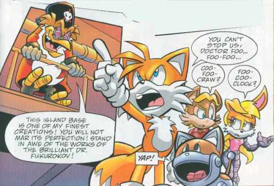 Tails rescues Antoine and the duo, along with T-Pup, infiltrate back into the Battlekuku headquarters. Meanwhile, the xenophobic Speedy discovers Bunnie’s ruse and attacks the reunited team with a battle robot.