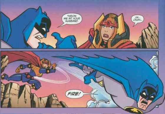 Big Barda seeks Batman’s help when Mister Miracle is kidnapped. The perpetrators are the Female Furies of Apokolips in hopes of dragging Barda back to their evil ranks. Luckily, our heroes are able to take down the Furies and the happy couple reunite. (That’s married couple. Taking notes, writers?)