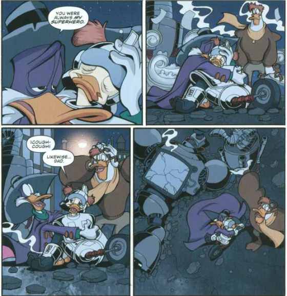 Bulba gets rid of the Fearsome Four (by sending them to the HR Bot) while Darkwing takes down the villainous steer. After learning the full backstory of Bulba’s plan with Quackwerks (and it’s connection to the Gizmoduck suit), Gosalyn accidentally activates the suit and become “Gozmoduck”. Our heroes take down Bulba and Quackwerks is taken over by Scrooge McDuck, who appoints Launchpad the new CEO. Watching these proceedings are Negaduck and Magica De Spell.