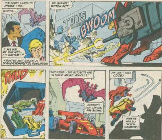 First it’s time to check in with Goldbug, the artist formerly known as Bumblebee. Captured by RATT, the Throttlebots receive an ally in Barnett, who realizes that the Autobots may actually be on our side. (Took them long enough!) So he engineers their escape in new temp bodies while their real ones were destroyed. When Ratbat and the Predacons figure out what’s happened, they decide to chase Barnett and Buster, who our heroes turned to for help, into a mall. Why are they at the mall? You’ll soon find out, but it has nothing to do with Spacebooger plushies.