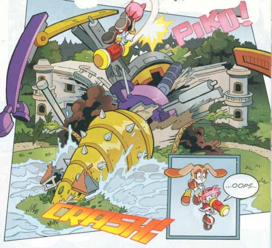 In a back-up story, Amy Rose meets Cream and her mom…and flatten their house with Snively’s latest attack machine. She offers them and the Chao a place in New Mobotropolis, which sets up the next Sonic Universe arc.