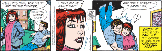 Hark and Lo, for I bring to thee more love from Mrs. Spider-Man. First, from a Spidey strip last week: