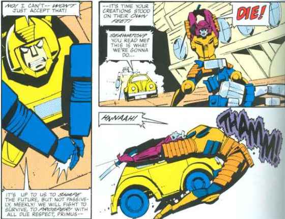 That’s right, kids. Bumblebee’s keen strategic mind strikes again, and with help from a fellow Autobot, shows up what would become a beloved Transformers character in the fandom. Badass? More like wet and sore ass.