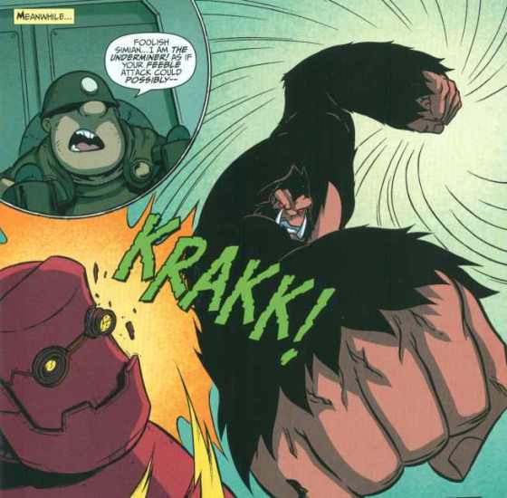 The supersized Ungorilla beats on the Underminer’s Incredibles-imitating robot. Meanwhile the Incredibles work to free the hostages. However, the true damage has been done. The Underminer has ruined the heroes’ reputation, and paid the price…at the hand of Xerek, who reveals the source of his operation.