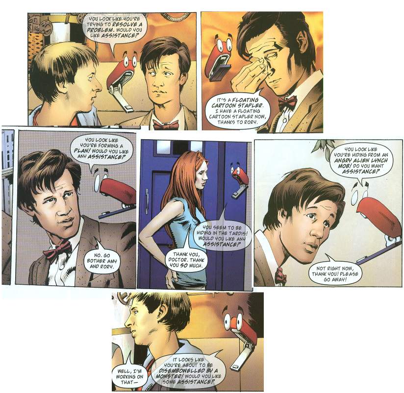 What they got right: Hey, a female companion who isn’t hot for the Doctor. Having a married couple on the ship is an interesting twist, so thank you Steven Moffat. And thank you IDW for keeping Tony Lee writing this comic. He continues to capture the spirit of the Doctor even with the new regeneration.