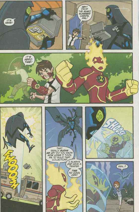 I really don’t watch the Ben 10 franchise anymore. When Alien Force started, it was actually rather good. Then Ben developed an ego that was cute at 10, but annoying at 15 (where he’s supposed to be now). It was fine for an arc, but nothing’s brought him down to Earth, and the clincher for me was when he used his powers so he could sneak out of his girlfriend’s tennis match to attend a Sumo Slammers movie premier. Do you really have to see it opening day? So now he’s a jerk, but this story is from when he was still a decent guy–and met himself when he was supposed to be a jerk.