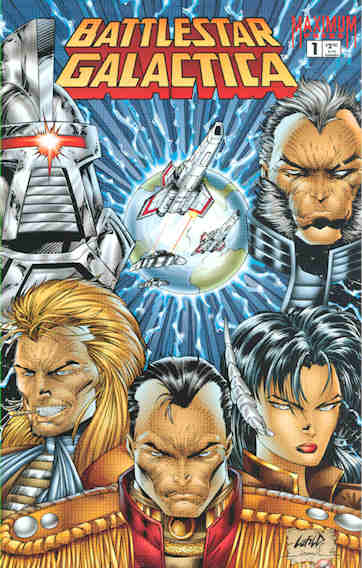 STORY: Rob Liefeld & Robert Napton LAYOUTS: Karl Altstaetter SCRIPT: Robert Napton PENCILER: Hector Gomez INKER: Rene Micheletti COLORIST: Angel McLaughlin COLOR SEPARATIONS: Extreme Colors LETTERING: Kurt Hathaway EDITOR: Matt Hawkins UPDATED CHARACTER & SHIP DESIGNS: Rob Liefeld & Karl Alstaetter.If you think that’s a lot for one comic, note that “Extreme Colors” is listed as consisting of around 14 people. Geez. Anyway, Liefeld also did the cover. Believe it or not, that’s Starbuck in the lower left corner, Baltar in the upper right, and Starbuck is scarier looking than Baltar. Also, I think that’s Athena in the lower right, with Apollo in the lower center. This doesn’t bode well, does it?