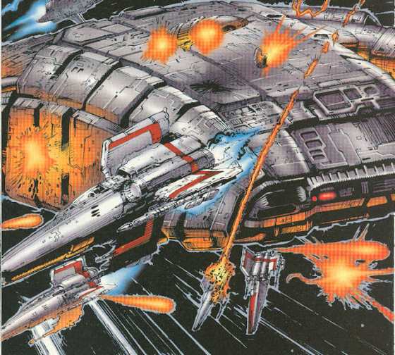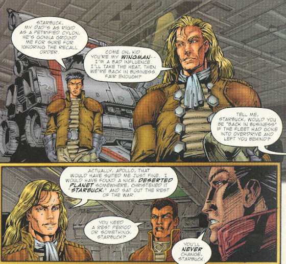 So far the biggest crime is the waste of panel space. Layouts would take two pages for no good reason other than to show off the artwork, the character and vehicle redesigns weren’t really all that necessary, and they blew up one of the most important vehicles for the stories, the place where everyone relaxed after a hard day of Cylon battling unless the Nomen happened to drop by, with little morning from its biggest resident.