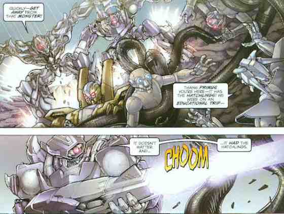 As Optimus continues to head for Megatron’s base, he flashes back to Sentinel Prime telling him that he believes Optimus is descended from the Primes as Sentinel is. Optimus doesn’t believe it and would rather join the science class. Megatron, upset that Optimus was offered the top spot, begins to slowly turn into the Megatron we know his as (at least by the time of last year’s prequel). We also see how Megatron met Starscream in this continuity.