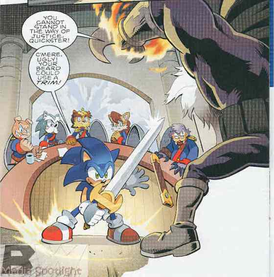 At another concert, Mina is interrupted by Geoffrey, who declares Ixis Naugus the true king of Mobotropolis. As he holds off the other Freedom Fighters, Sonic fails to stop the wizard from invading the council chambers, where Sonic, armed with the Sword of the Acorns, stands ready for battle.