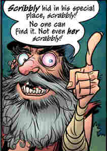Battlepug is framed as a story told by a naked woman…hey, wait until I finish talking about the comic! You don’t get to see the goods anyway, your pervs! Anyway, Moll tells her story to two talking dogs, Colfax and Mingo. The tale she weaves speaks of the adventures of an unnamed warrior, the only survivor of his village’s destruction seen above. Swearing revenge, he seeks the beast and the mage who set it upon his people. In his third adventure, the warrior meets the titular canine, and a crazy old man who opens his sentences with “scribbly” and closes them with “scrabbly”.