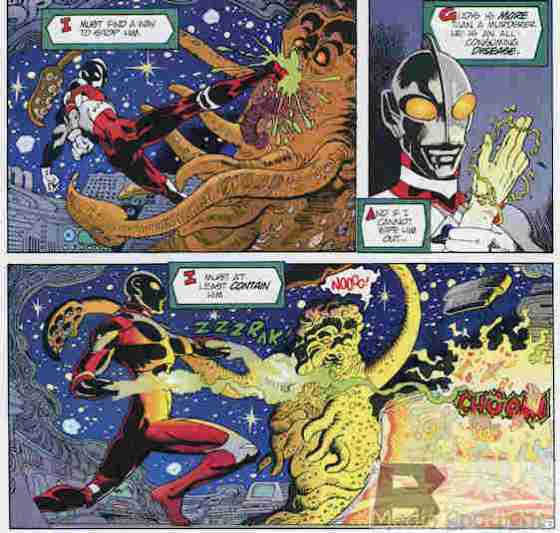 Apparently Ultraman’s been hunting him for a while and plans to bring him to justice. (This version has him locking up monsters he’s not forced to destroy, kind of like Green Lanterns rather than your usual monster-fighter.)