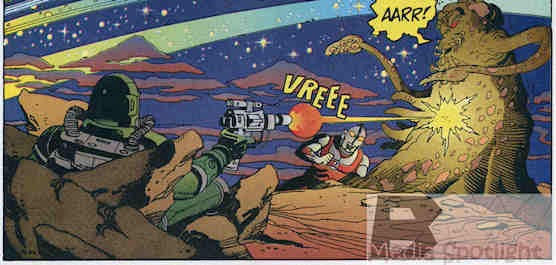This one goes out to Apollo Z. Hack/Matt Burkett, a Saturday Night Showcase member and a big Ultraman fan. (Not the DC character, the Japanese hero.) In fact he’s preparing a documentary on his introduction to the franchise, Ultraman: Towards the Future (aka “Ultraman Great), another Saturday Night Showcasee. He’s been curious about Harvey’s Ultraman comic so I thought I’d use the occasion of the Friday Night Fights to give him an example. Also I needed a fight for this week.