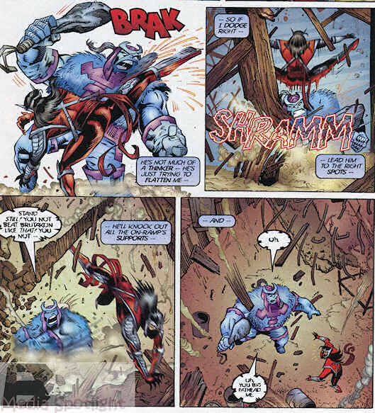 Denny’s been given the power to transform into a video game hero (a game that sadly was never released in the real life, if it was even produced). The issue’s title initiates the transformation and the title of this article changes him back. However, the villains are brought through as well, such as Brutakon.