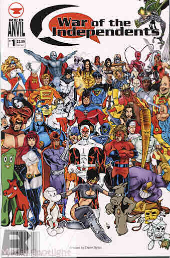 Compare this with the web comic Crossoverkill, a similar story currently in production online. Like its parent, Crossoverlord (you may recall me mentioning this comic a few times) it brings together superhero characters from different online comics. However, it keeps to a short main cast, gives you an idea of what the problem is, and introduces everyone. In War of the Independents, unless I missed an issue #0, it’s more like playing “Where’s Waldo” with your favorite smaller (but still Diamond-approved–I don’t seen anyone from Jerzy Drozd’s The Front, for example) publisher characters, like Cerebus, The Tick, Too Much Coffee Man, and Gumby, just to name ones I’m at least casually aware of. It just feels like it was done to show off a bunch of indie characters and not much else.