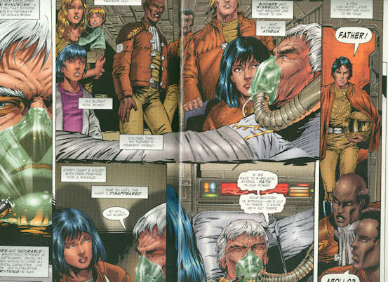Back on the Galactica…the original one, I’ll try and keep this as unconfusing as I can unless it’s funny, which is admittedly unlikely with me as the writer…they caught a scan of their future counterpart but write it off as an echo of their own ship. Heh? Then Athena comes into…oh, for crying out loud, Liefeld’s Galactica! Anyone here remember my review of the very first comic? Where I said that when they did the classic versions of the characters the character models were relatively good? Here’s how Athena was drawn by her father’s deathbed.