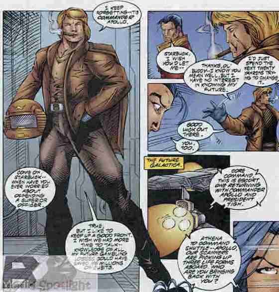 - What are Apollo, Athena, and, Adama thinking now that Zac and Ila are not dead but in the future? I remember that had an impact on especially the kids actions in the pilot (I’m sure that was an influence on Athena telling Starbuck she couldn’t commit to a relationship leading Starbuck to meet someone else), plus there’s no grieving scene for Lorne Green now.
