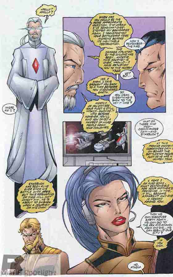 There is more character in those three panels than in the entire series. You’ll note that Athena warns Apollo Returns that there’s a stowaway, but it’s not Starbuck. It’s Ila, who insists she HAS to join them. To not pollute the timeline? No, I’ll kill that theory soon enough. Galactica The Dark Knight will keep the Cylons away from the fleet long enough for them to escape. Apollo Episode 1, Starbuck the Early Years and Zac the Breathing decide they have to help their counterparts, but Zac is hit in a fight we never get to see and has to land on Galactica Beyond, which taking a major beating. Cain’s Viper is destroyed, the Battlestar is about to get wasted and suddenly Apollo is in a void talking to Elias. I’ll just post the full page and let you see what I’m about to rant about.
