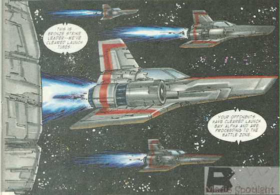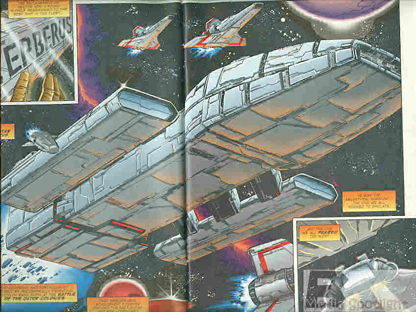 It’s a good story, which makes this the first time I have ever written these words about a Robert Napton-written Galactica story. I’m wondering if the lack of Liefeld involvement helped that. In the three mini-series (not counting the “filler” story written by Richard Hatch) Rob Liefeld is credited as coming up with the story while Napton wrote the script. Here it’s all him and maybe that’s the difference that helps the story. Even the layouts look better here than in the mini-serieses. (Is that a word?) While the panel above is the three panels above two pages, only take half a shot as it’s a good reveal of the Cerberus. There are no jagged panels when nothing is occurring. The pacing is far superior. The art, while still suffering from being a Maximum Press title and changing art teams between parts 1 & 2, is better. I also like the design of the early Vipers, perhaps even more than the Vipers from the time of the series.